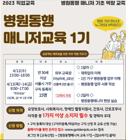 병원동행매니저로 취업하려면 서울노인복지센터 부설 서울시어르신취업지원센터에서 '병원동행매니저교육'을 실시하고 있습니다. 2021년에는 1회가 진행되었고 15명이 수료했고, 올해는 3회가 진행되어 42명이 수료하였고 만 50세 이상 서울시 시민이면 교육을 들을 수 있고 현재 18명이 병원 동행 매니저로 활동하고 있습니다.